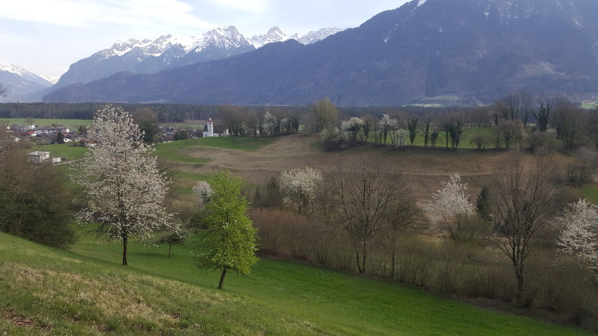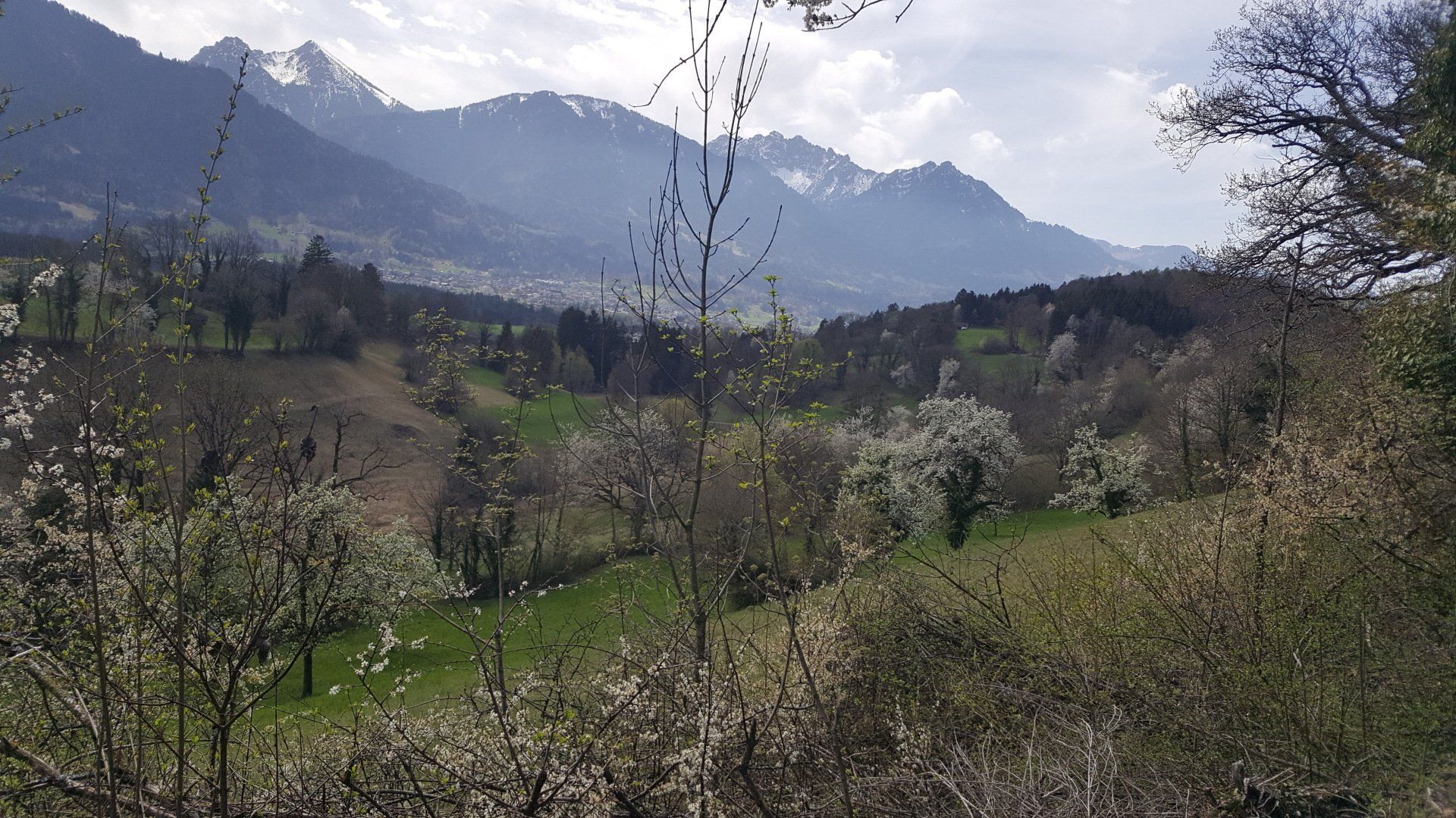 In der Bildmitte verläuft fast horizontal der internationale, literarische Wanderweg, der für Spaziergänge geradezu prädestiniert ist. Dreiviertel der ca. 1,4 km langen Wegstrecke bieten eine herrliche Aussicht über den Walgau, westlich nach Nenzing und Gurtis, südlich nach Bludesch und östlich nach Thüringen und Ludesch.