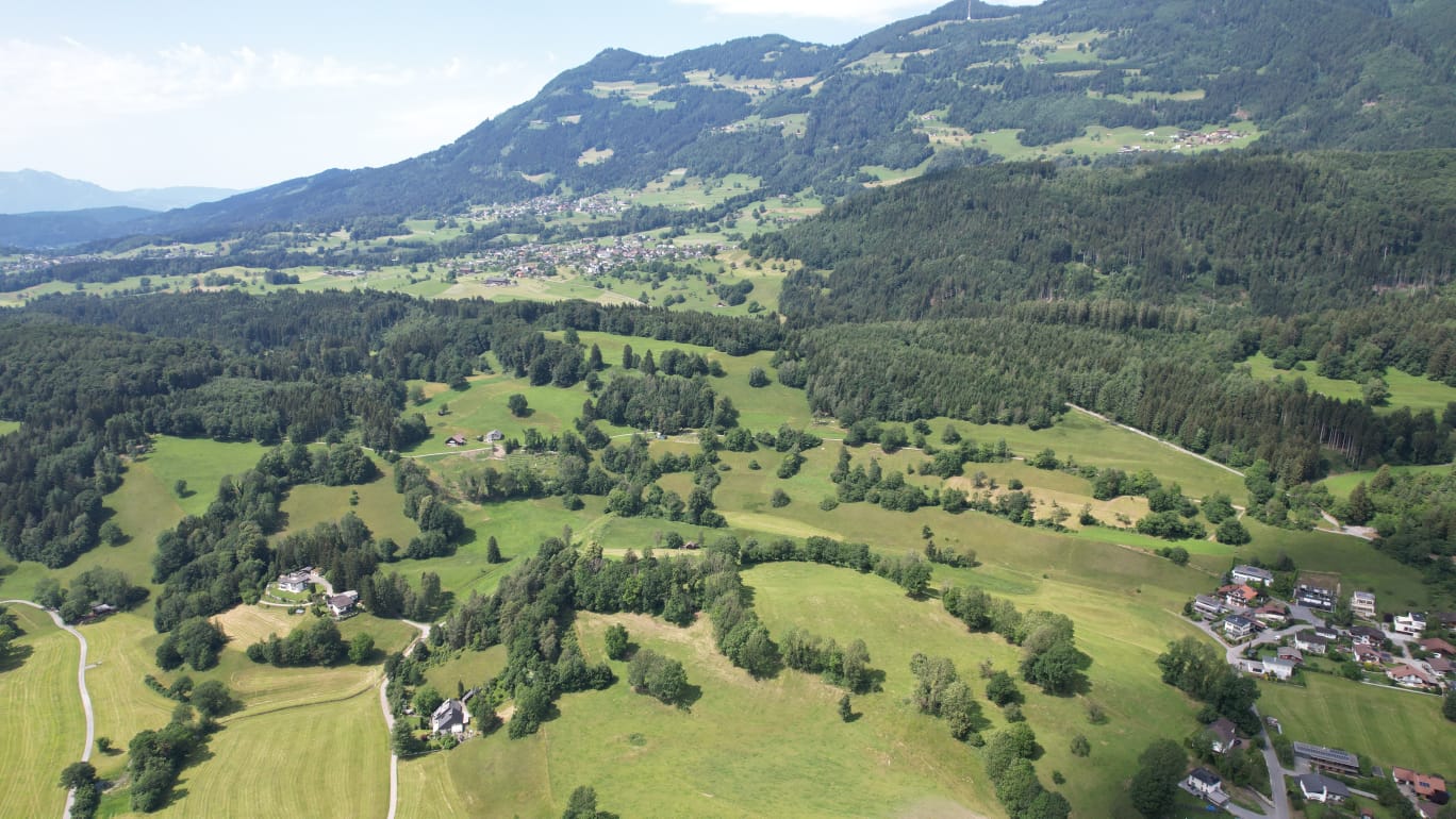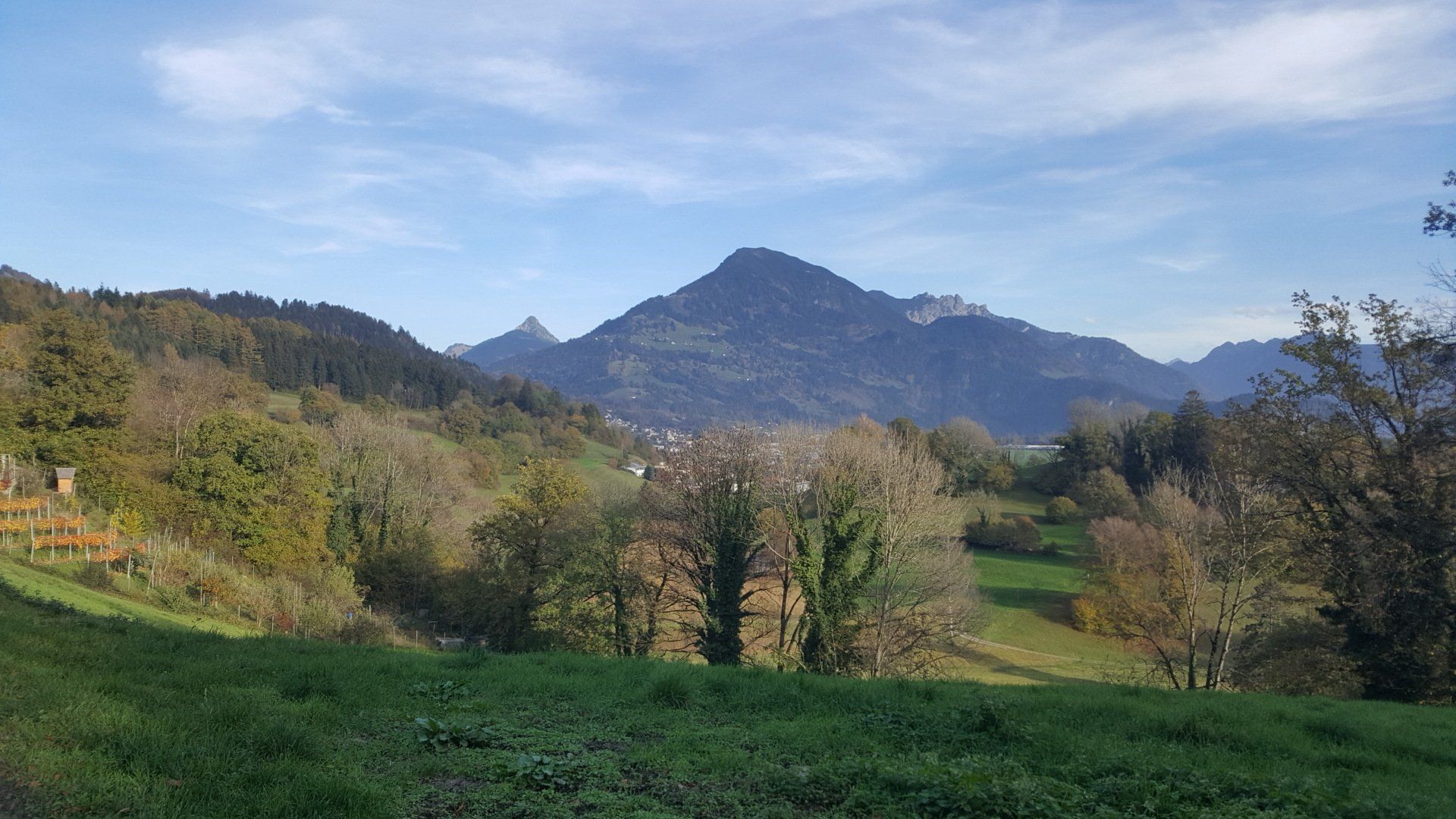 In der Bildmitte verläuft fast horizontal der internationale, literarische Wanderweg, der für Spaziergänge geradezu prädestiniert ist. Dreiviertel der ca. 1,4 km langen Wegstrecke bieten eine herrliche Aussicht über den Walgau, westlich nach Nenzing und Gurtis, südlich nach Bludesch und östlich nach Thüringen und Ludesch.