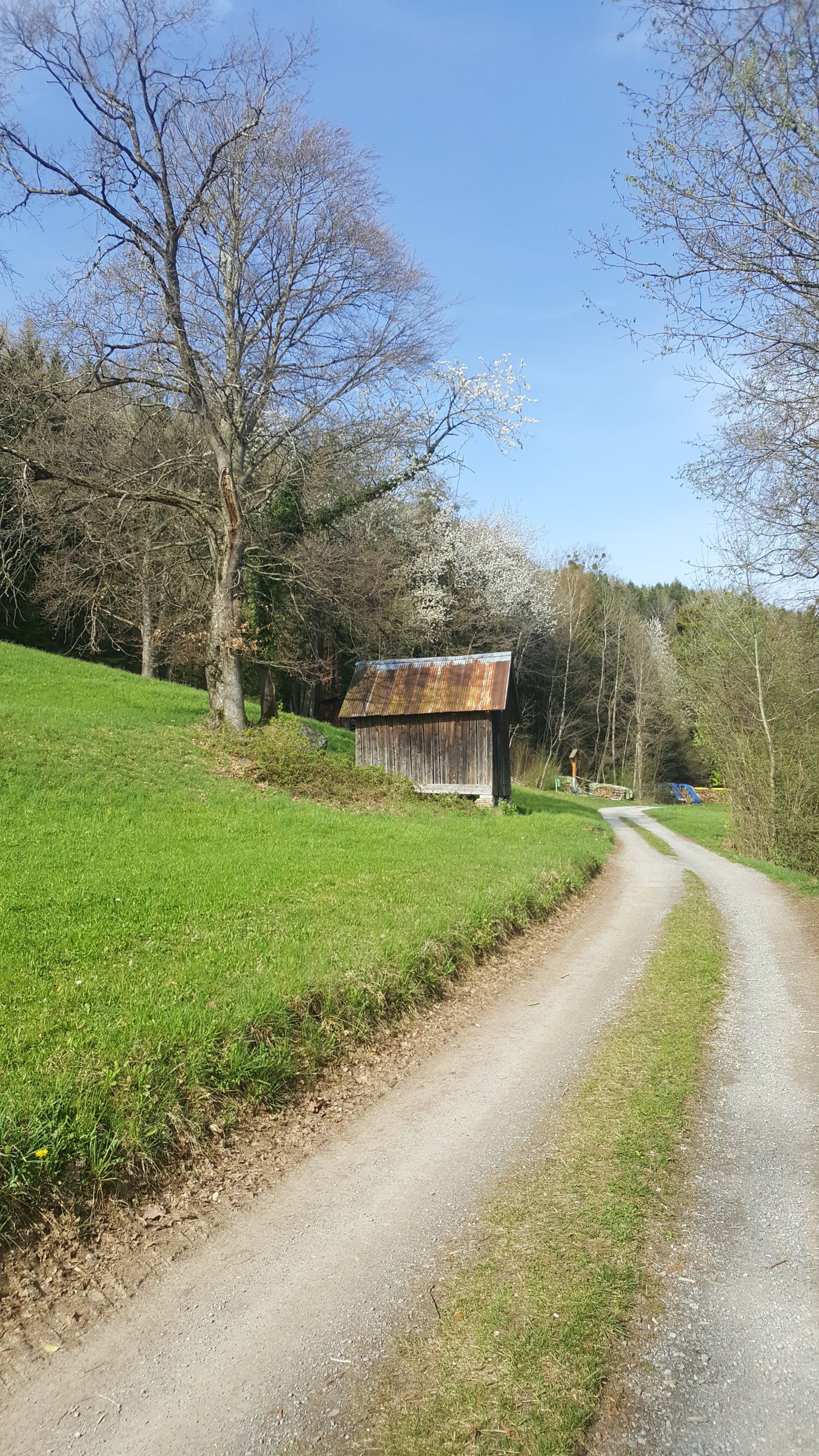 befindet sich ein Wiesenweg, der zum Corona-Bänkle führt. Klaus Illmer hat dort 2020 mit viel Engagement, handwerklichem Geschick und Liebe zum Detail eine wunderbare Natursteinmauer, ein Marien-Marterl und ein Naturzelt samt Ruheplätzchen für seine Enkelkinder errichtet.