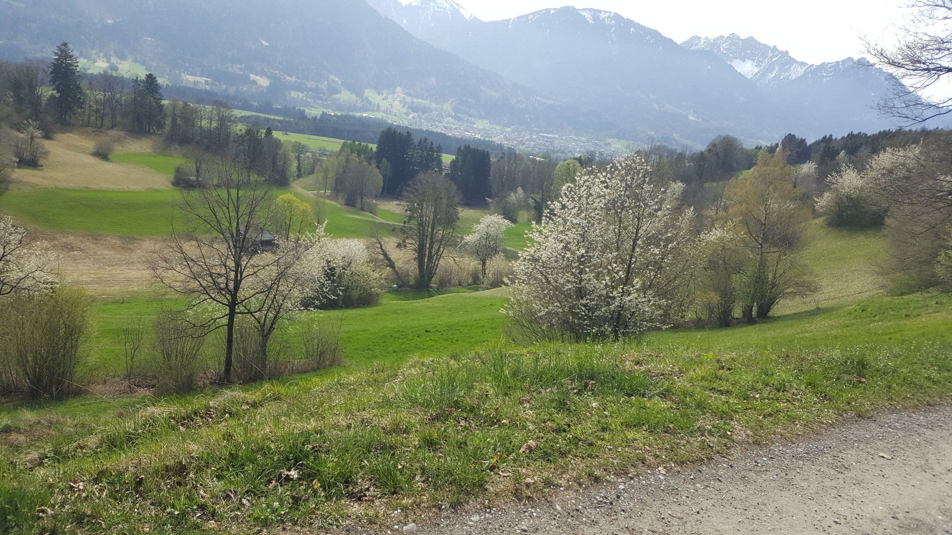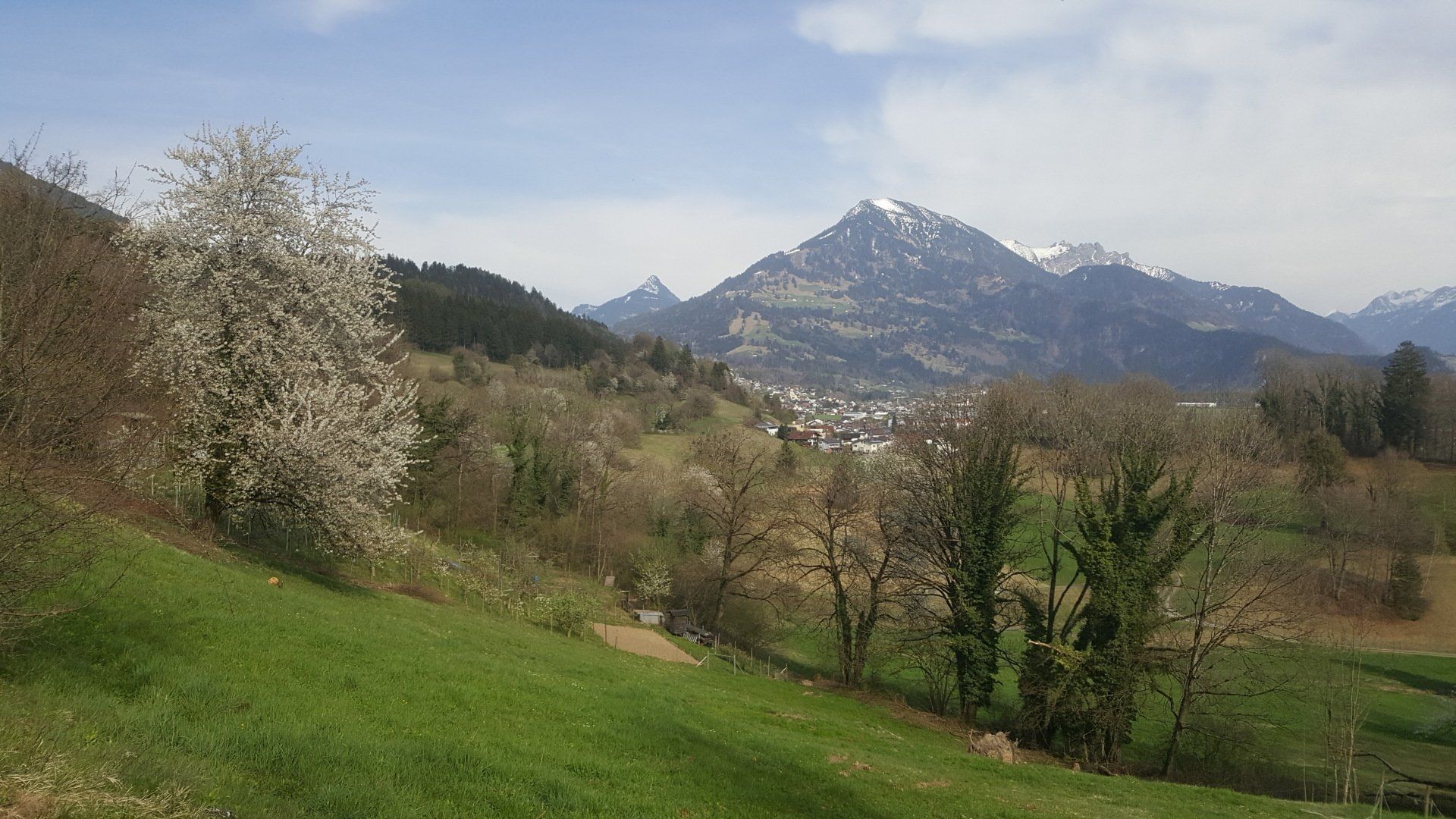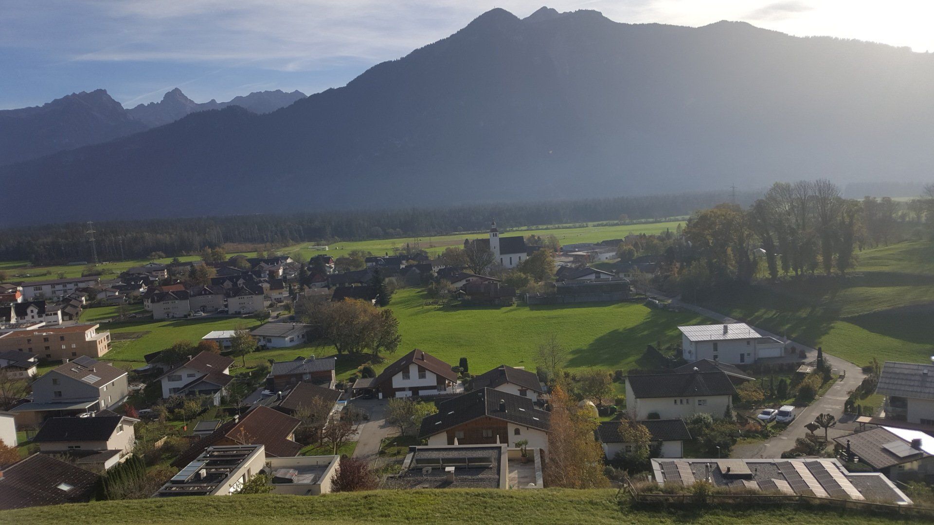 In der Bildmitte verläuft fast horizontal der internationale, literarische Wanderweg, der für Spaziergänge geradezu prädestiniert ist. Dreiviertel der ca. 1,4 km langen Wegstrecke bieten eine herrliche Aussicht über den Walgau, westlich nach Nenzing und Gurtis, südlich nach Bludesch und östlich nach Thüringen und Ludesch.