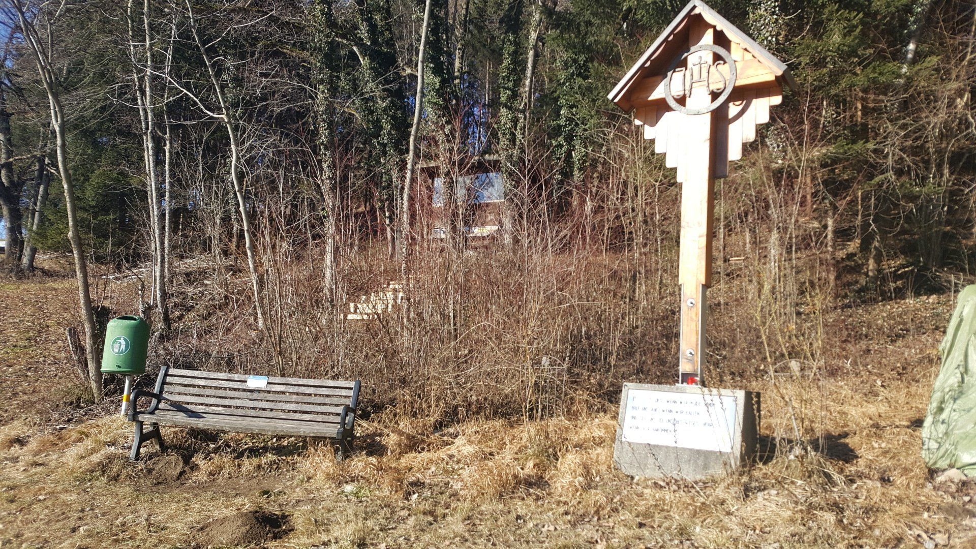 befindet sich ein Wiesenweg, der zum Corona-Bänkle führt. Klaus Illmer hat dort 2020 mit viel Engagement, handwerklichem Geschick und Liebe zum Detail eine wunderbare Natursteinmauer, ein Marien-Marterl und ein Naturzelt samt Ruheplätzchen für seine Enkelkinder errichtet.