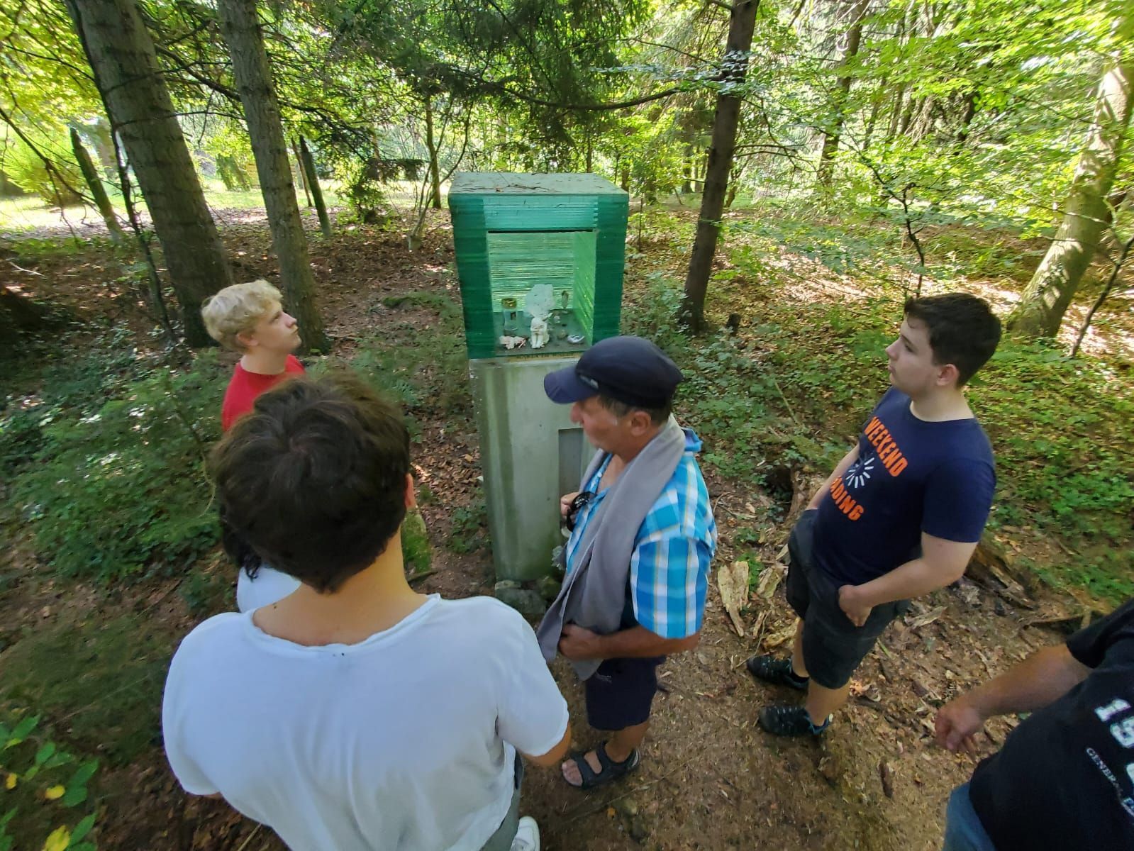 Nach dem kurzen Aufstieg hinauf zum Runkelinaweg kam die Gruppe bei der 1. Infotafel an, die zugleich das 10. Texthaus von Osten kommend darstellt. Dort konnten die jungen Menschen und ihre Lehrherren die eigene Handwerkskunst in der freien Natur bewundern. Klaus nahm die Platte samt Text heraus, um zu zeigen, wie alles fixiert worden ist.