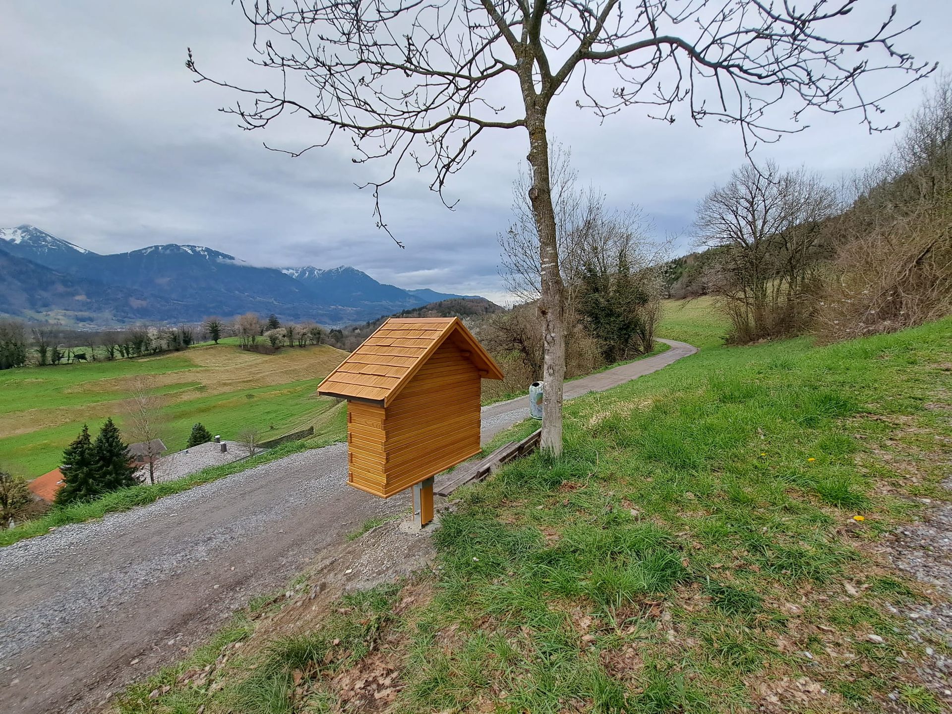Hilde ist zufrieden, dass das Kreuz, das Häuschen und die Bank eine Harmonie bilden. Welch´ wunderbarer Platz zum Genießen, Ausruhen und Innehalten!