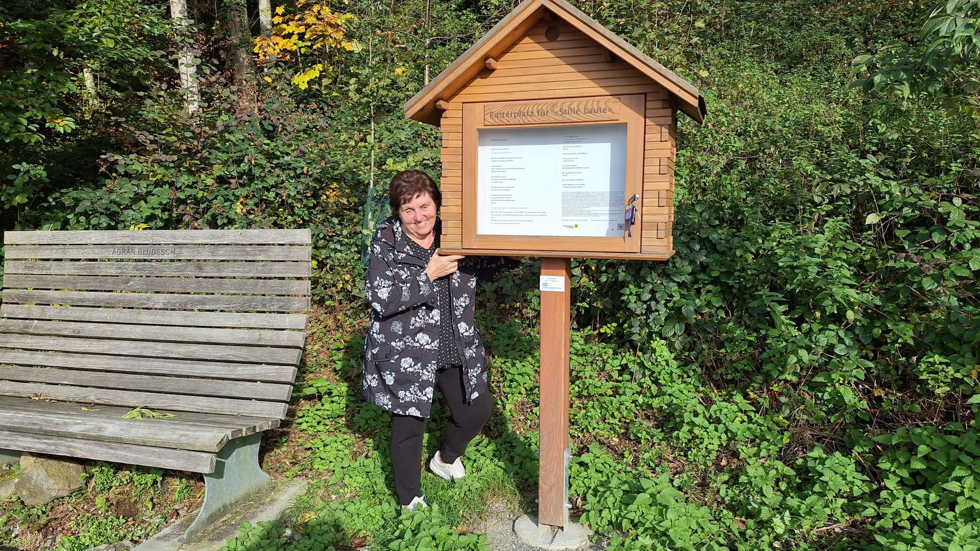 Diese einmalige Bank der Agrar-Gemeinschaft und anspruchsvolle Lyrik von Jytte Dünser, der Mundart-Autorin aus Frastanz bilden eine Einheit, die sowohl Wandernden als auch Literatur-Interessierten zur Verfügung steht. Jytte hat ihrem verstorbenen Mann Albert zwei sehr tiefsinnige Texte gewidmet. Auch diese wurden in die Schriftsprache übersetzt, dass auch Menschen mit anderen Dialekten bzw. Menschen, die schriftsprachlich reden, lesen und schreiben, sich auf für sie ungewohntem Sprachgebiet einlesen können.