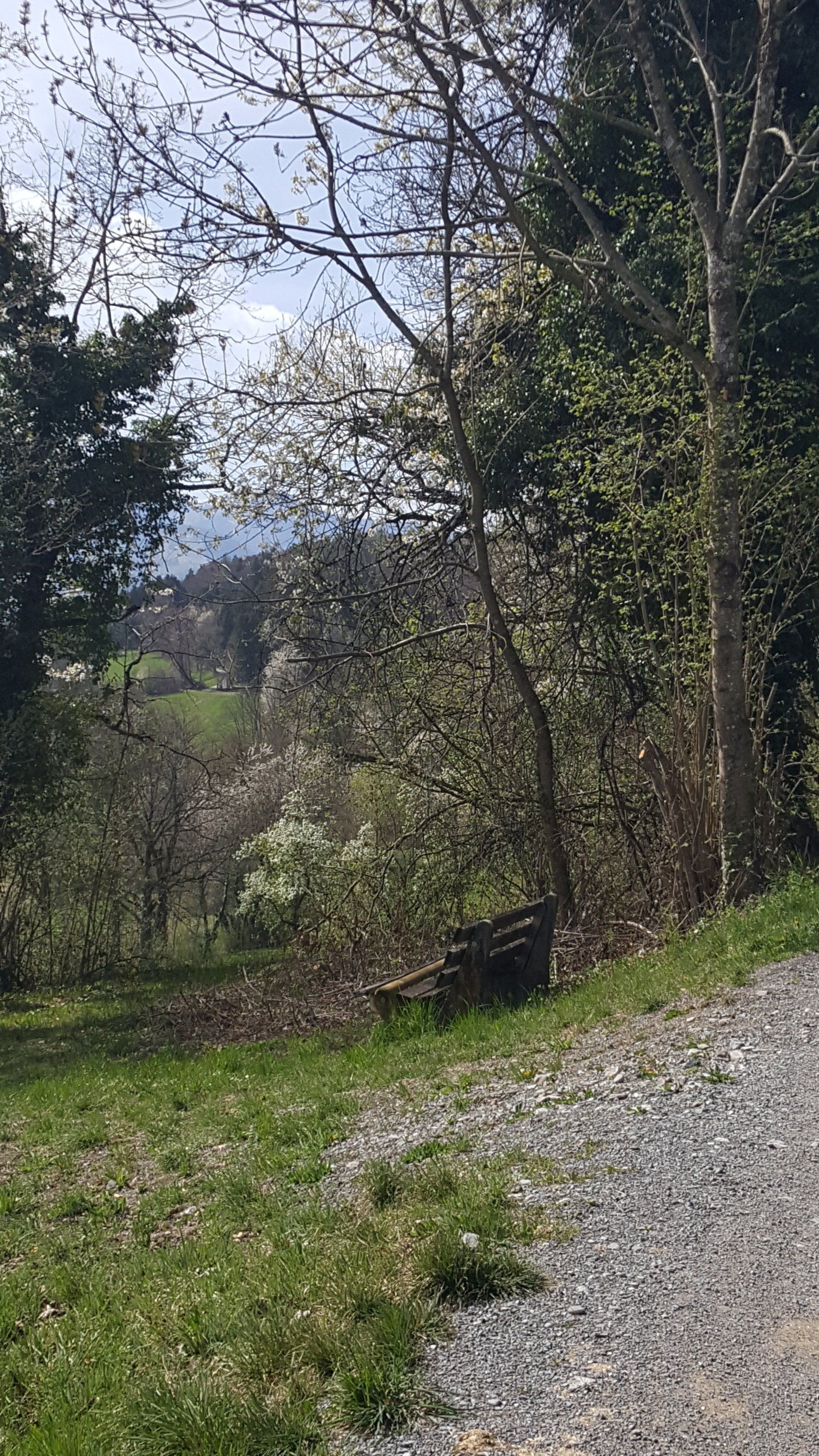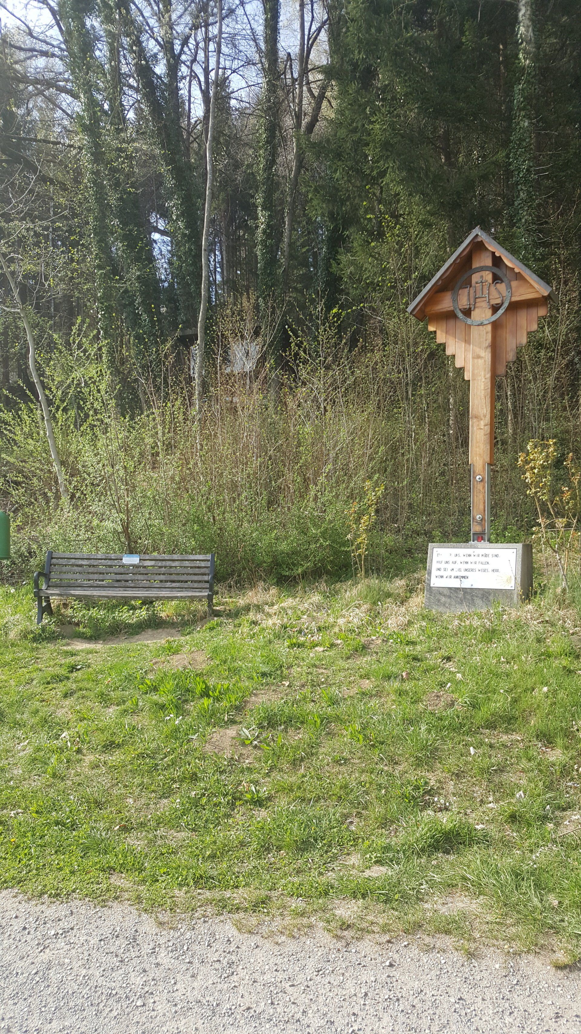 befindet sich ein Wiesenweg, der zum Corona-Bänkle führt. Klaus Illmer hat dort 2020 mit viel Engagement, handwerklichem Geschick und Liebe zum Detail eine wunderbare Natursteinmauer, ein Marien-Marterl und ein Naturzelt samt Ruheplätzchen für seine Enkelkinder errichtet.