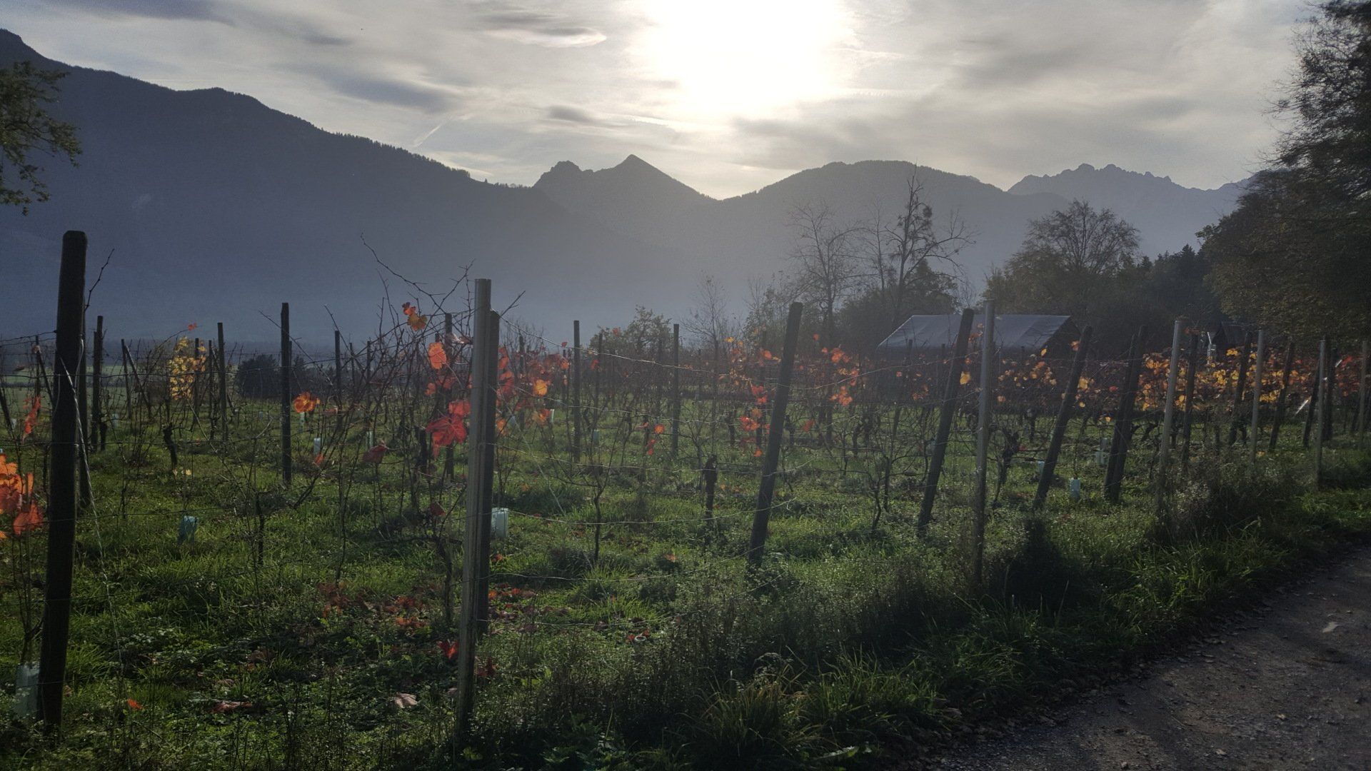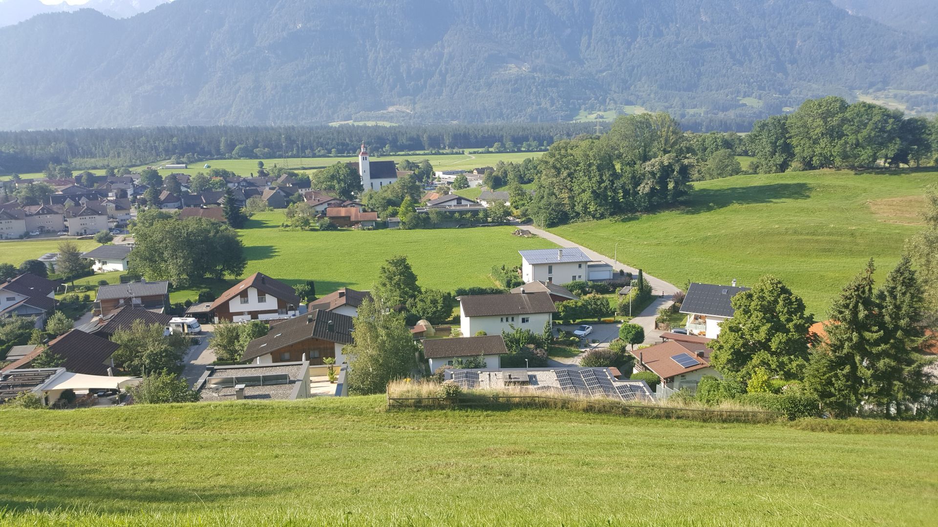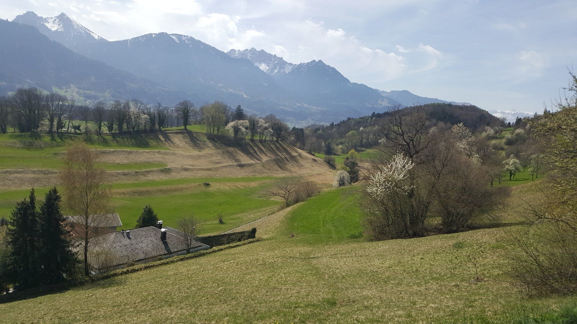 In der Bildmitte verläuft fast horizontal der internationale, literarische Wanderweg, der für Spaziergänge geradezu prädestiniert ist. Dreiviertel der ca. 1,4 km langen Wegstrecke bieten eine herrliche Aussicht über den Walgau, westlich nach Nenzing und Gurtis, südlich nach Bludesch und östlich nach Thüringen und Ludesch.